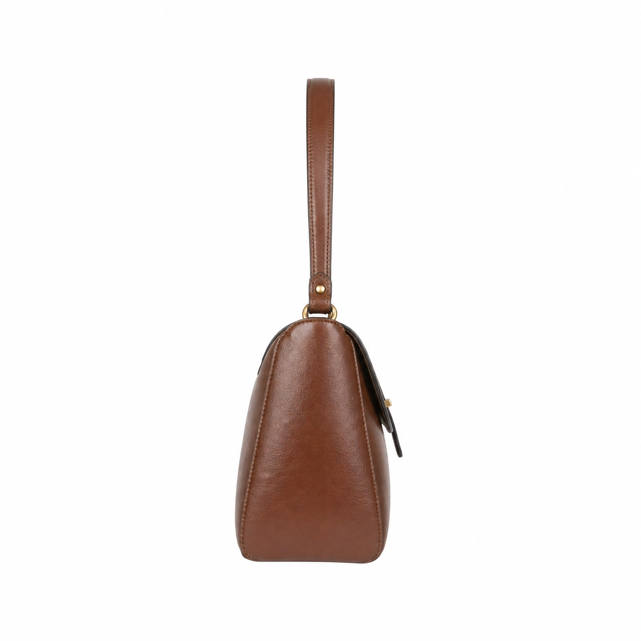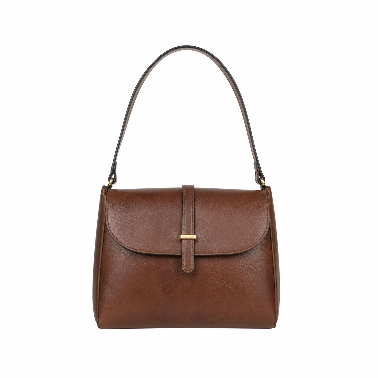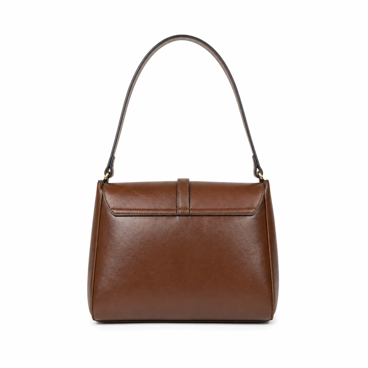 Update your everyday accessory collection with this structured shoulder handbag. Crafted from smooth faux leather, it features a classic front flap closure accented by a vertical strap and a minimal gold-tone metal detail. The bag is equipped with a single, flat shoulder strap attached via metal rings, designed for comfortable carrying under the arm or by hand. Its flat rectangular base ensures the bag maintains its balance and upright position when placed on a solid surface.