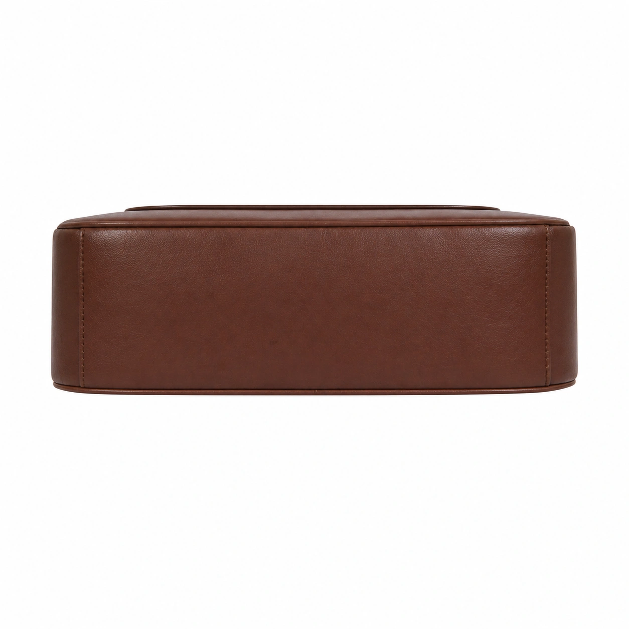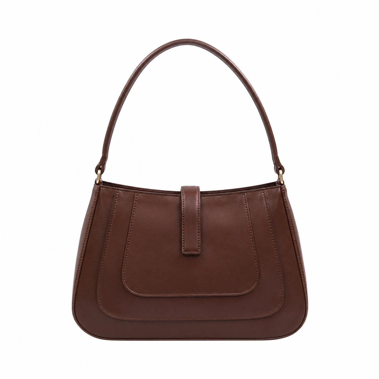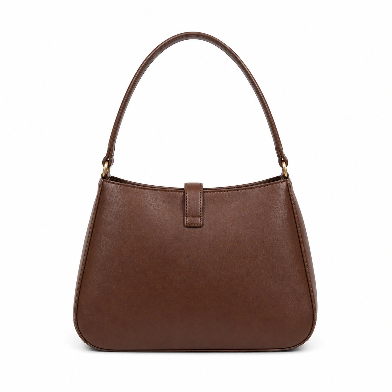 Add a versatile accessory to your collection with this structured shoulder handbag. Crafted from smooth faux leather, the bag features a layered front panel design secured by a central vertical strap detail. The balanced silhouette and flat base provide a neat shape that rests comfortably under the arm. It includes a single, fixed shoulder strap connected by sturdy gold-tone metal rings. The minimalist exterior and solid base ensure practical daily use and stability when placed on flat surfaces.