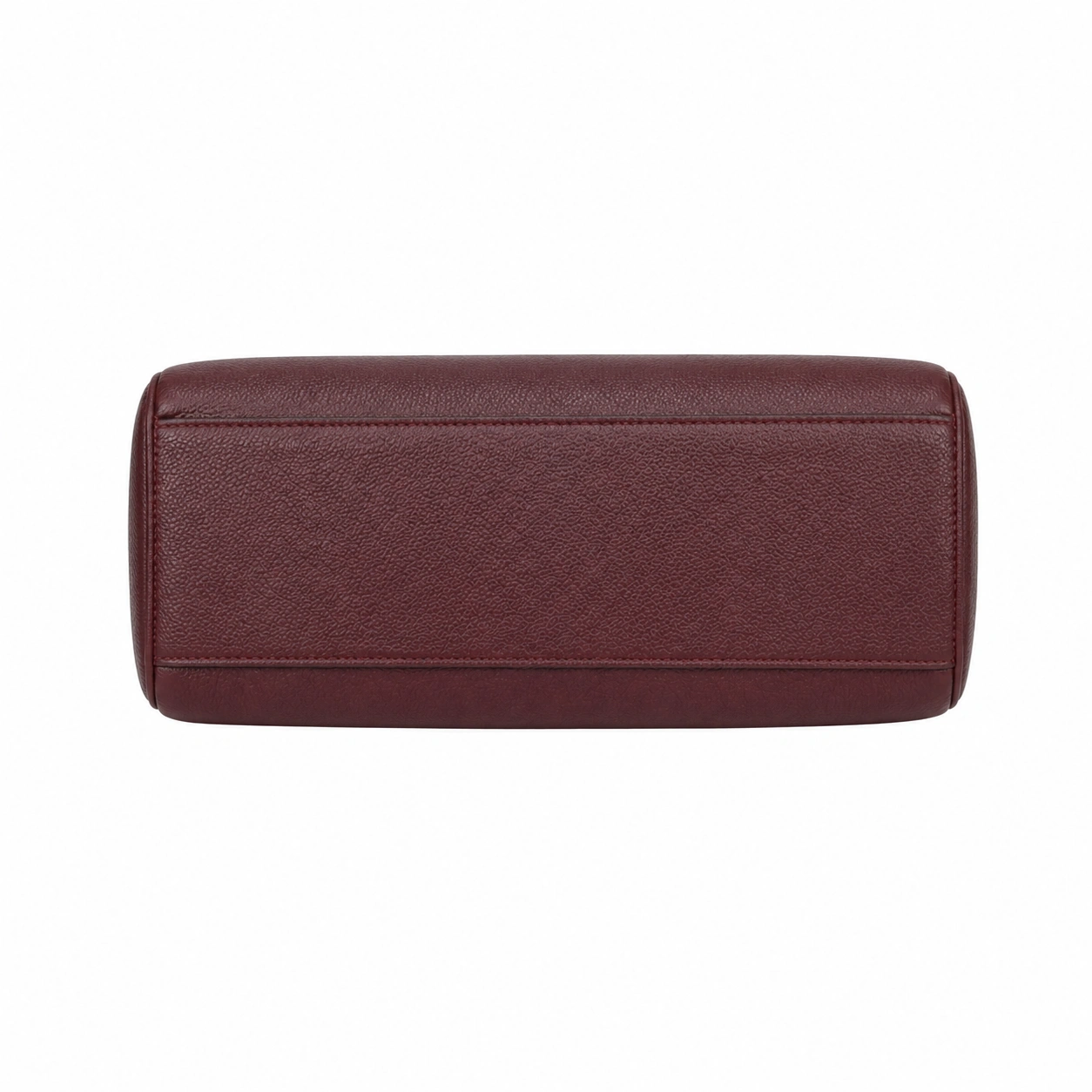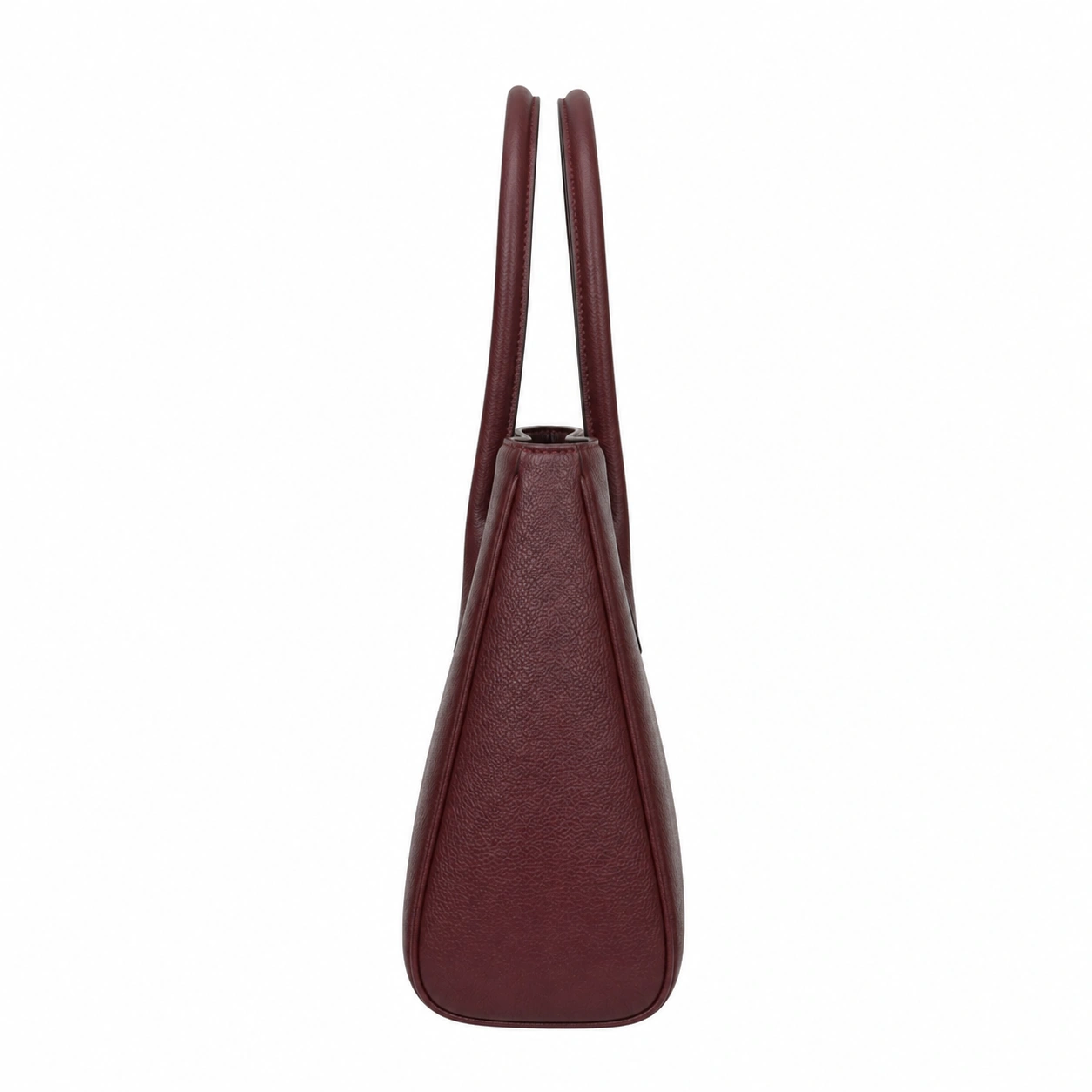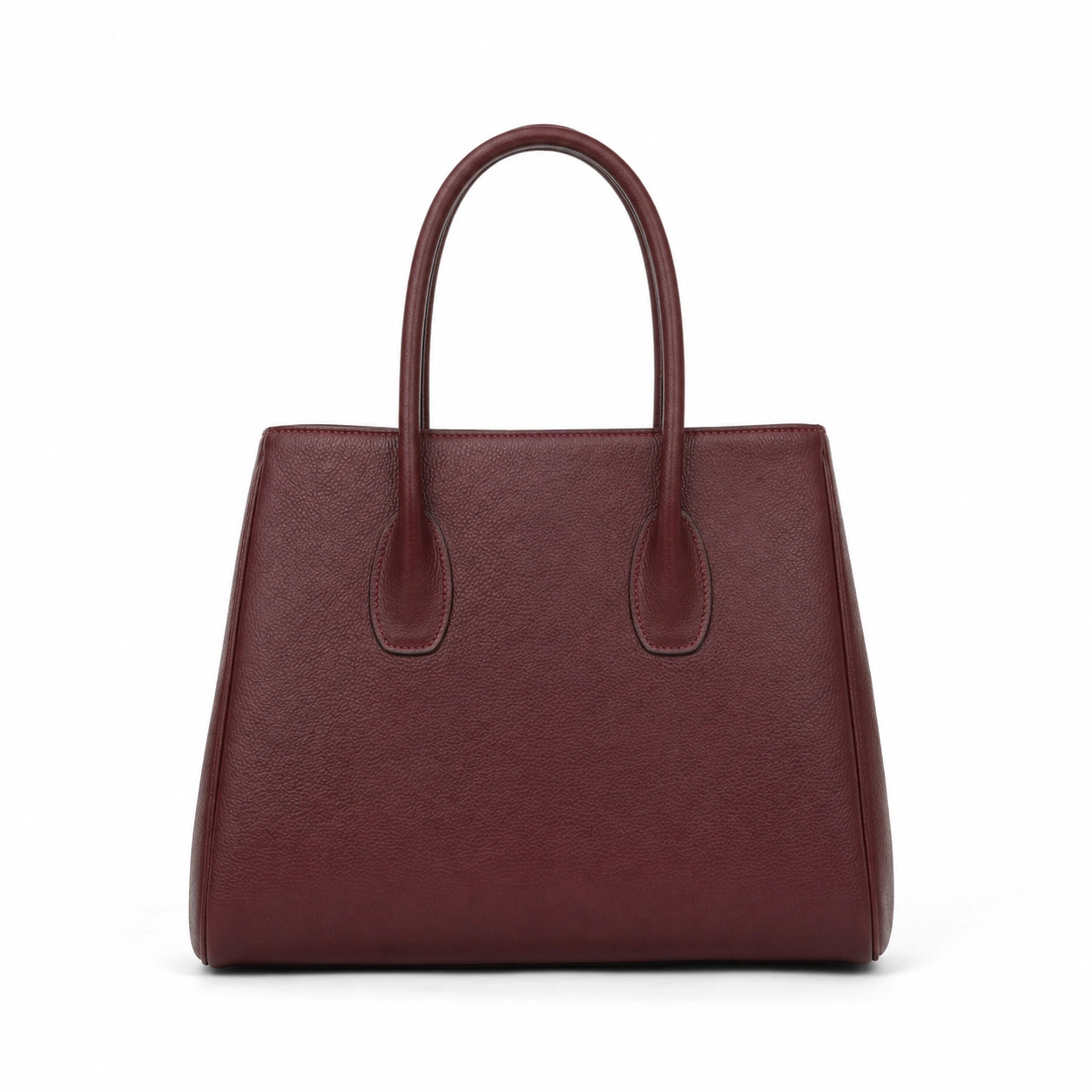 Organize your daily essentials with this structured tote handbag. Crafted from durable textured faux leather, this bag features a classic trapezoid silhouette with clean lines and a minimalist exterior. It is equipped with sturdy, rolled double handles featuring teardrop stitched bases for secure and comfortable carrying by hand or over the forearm. The flat, reinforced bottom panel provides stability, allowing the bag to stand upright independently while maintaining its tailored shape on any flat surface.